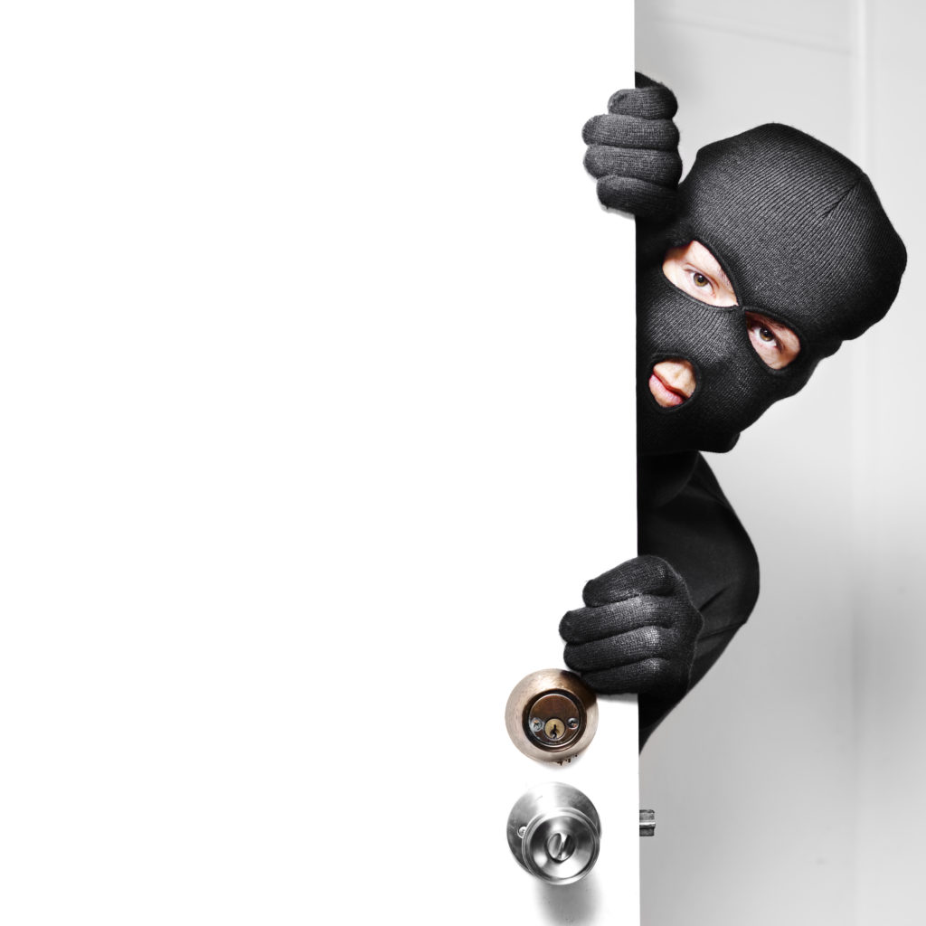 Home burglary concept with a burglar sneaking in a open house door during a break and enter past security locks and alarms, white background with copyspace