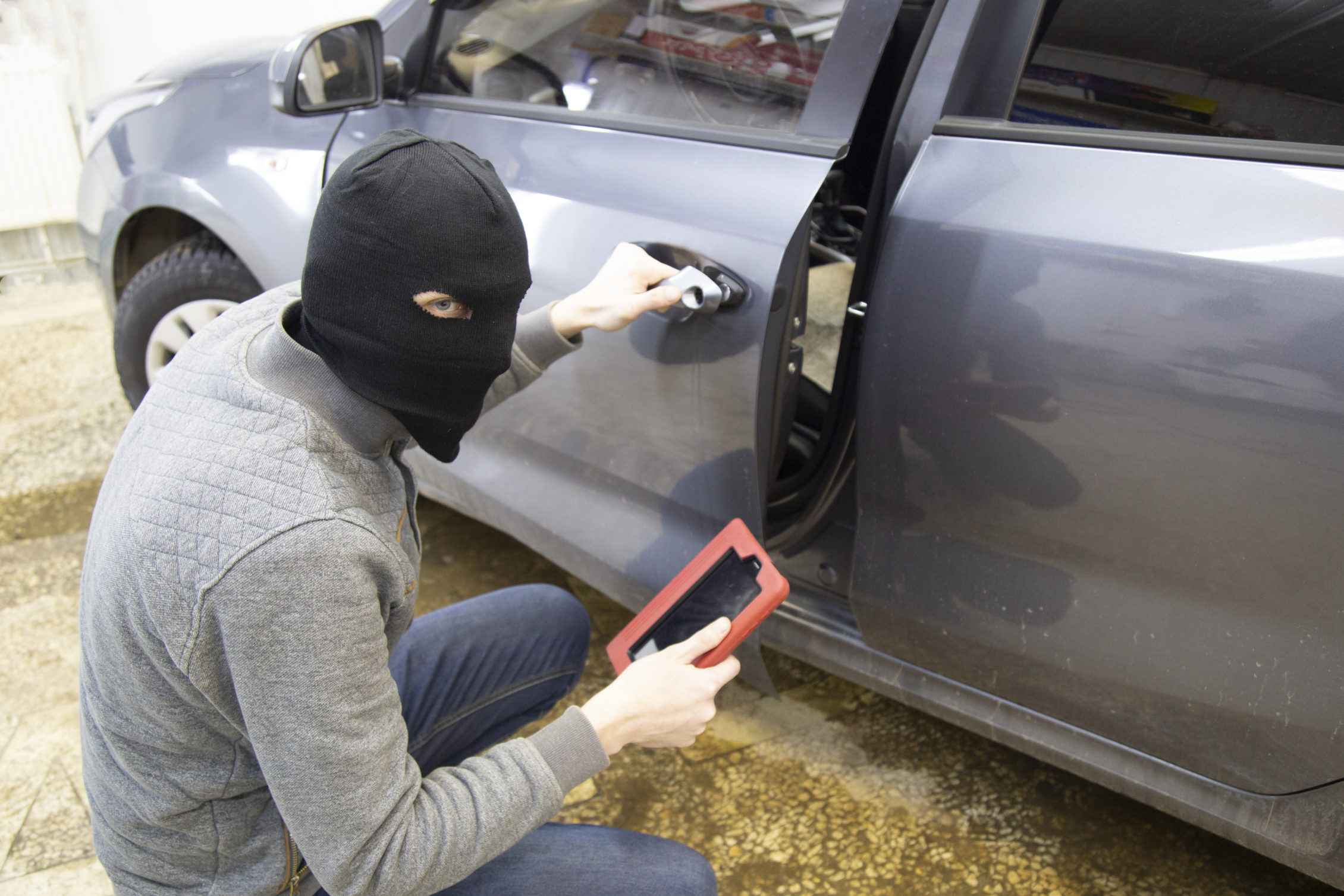 The hijacker tries to break into the car with a scanner. Code grabber . Car thief, car theft.