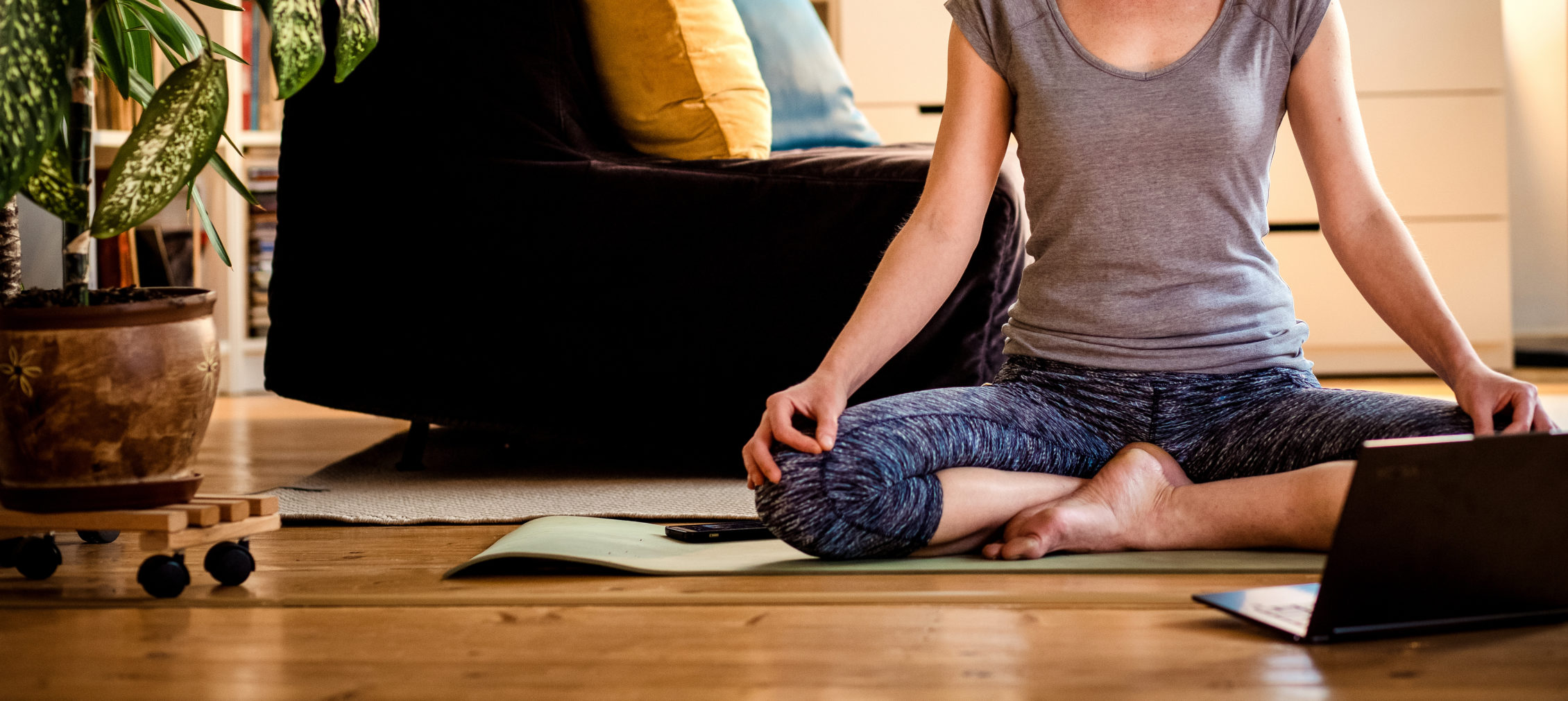 woman doing yoga workout at home watching videos online on laptop computer